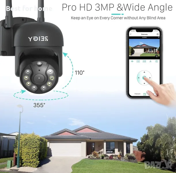 Можете лесно да управлявате безжичната външна камера от ПРИЛОЖЕНИЕТО eseecloud, за да я завъртите на 355° хоризонтално и на 90° вертикално, за да покриете всеки ъгъл на вашата къща или градина. Пълно покритие във всеки ъгъл.
