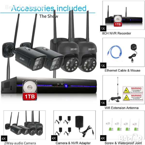 Тази система с безжични камери може да добави 4 допълнителни безжични камери за пълно наблюдение на 8 канала. Нашият 3MP NVR работи перфектно с всички REIGY WIFI камери (B0BL418272, B09LM5WL28, B09B174GQX, B098LQDYTJ, B08Z7J873V, B08MB1DDQ1, B09G7KY5W9, B07YGYB464, B09QKPY).