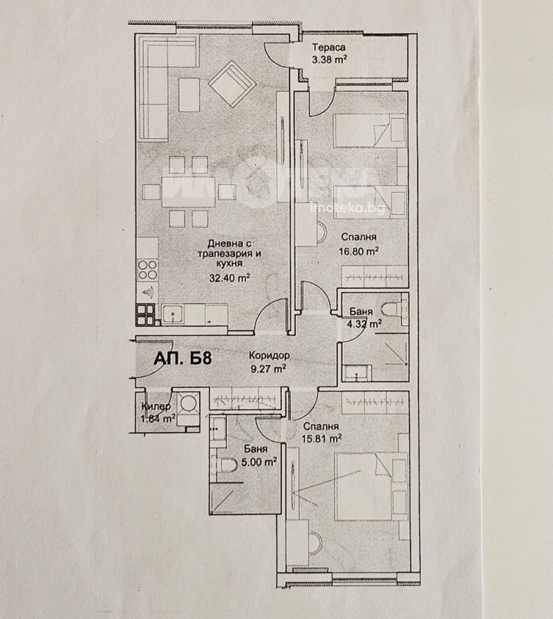 Състои се от коридор с килер и ниша за вграден гардероб 9.27кв.м, дневна с трапезария и кухня 32.40кв.м, баня с тоалетна 4.32кв.м, спалня 16.80кв.м, втора спалня 15.81кв.м + баня с тоалетна 5.00кв.м, тераса 3.38кв.м.