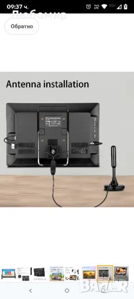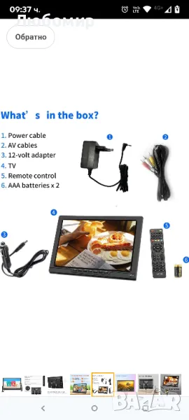 Преносим телевизор, дистанционно управление, захранващ адаптер, зарядно за кола, антена и ръководство за потребителя. Съвети: антената трябва да бъде свързана към USB порт.