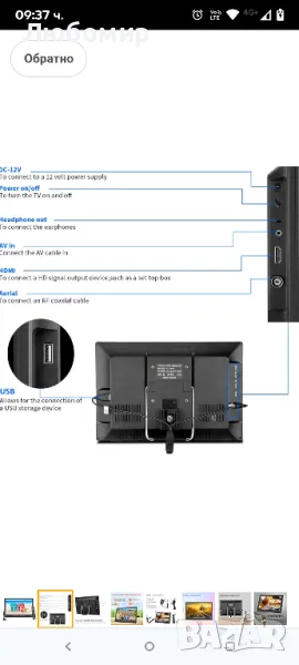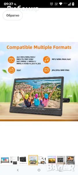 KCR 14-инчов преносим цифров телевизор DVB-T2, със захранващ адаптер и 12V зареждане за кола, AV вход, HDMI вход, USB слот, батерия, дистанционно управление.Екранът – разполага с висококачествен екран с резолюция 1366 * 768, осигуряващ яснота и богати цветове, с вградени стерео високоговорители. DVB-T2 Freeview тунерът означава, че преносимият телевизор може да се използва в Европа, където е наличен DVB-T2 сигнал. Входна честота: UHF 177.5 MHz-226.5 MHz, UHF 474 MHz-866 MHz.ВГРАДЕНА АКУМУЛАТОРНА БАТЕРИЯ, 12V ЗАРЕЖДАНЕ ЗА КОЛА И ЩЕПС ЗА ЗАХРАНВАНЕ КЪМ МРЕЖАТА - Идеални за употреба в кемпер, каравана или къмпинг с акумулаторна батерия (работа до 2-2,5 часа) или 12V адаптер за автомобил (включен). Или използвайте този преносим телевизор, включен в захранващ адаптер.- 14-инчов телевизор с USB, HDMI вход и AV вход, жак за слушалки, вграден високоговорител.Възпроизвеждайте вашите собствени филми, снимки и музика от USB, когато ви е удобно, както и всякакви записани програми. Поддържани формати: AVI, MP3, WMA, MKV, DIVX, MOV, VOB, FLV, 3GP, DAT, MPEG, MPG, MP4, JPEG снимки и др.