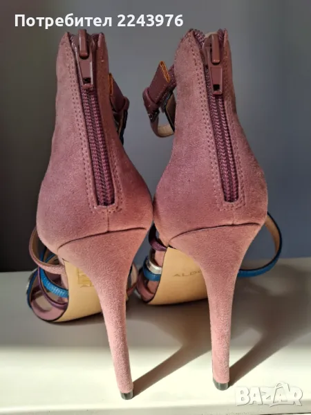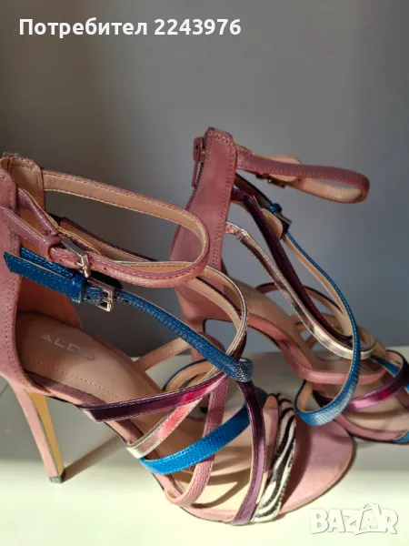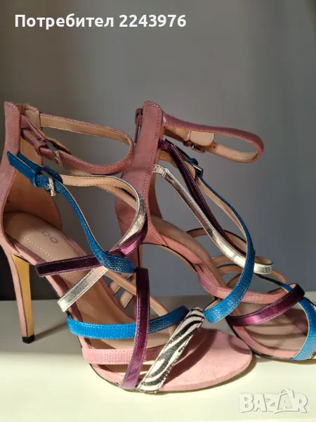 Сандали с цветни каишки и розов велур на марката Aldo. Дължина на тока 11см. Дължина на стелката 24.5 см. Нови,неупотребявани.
