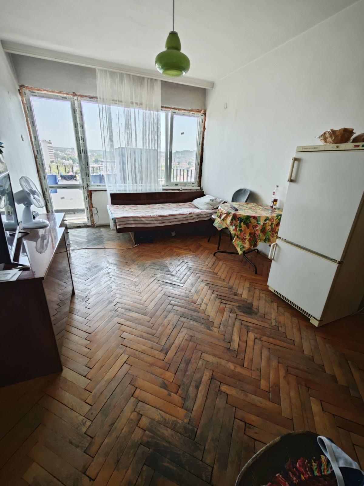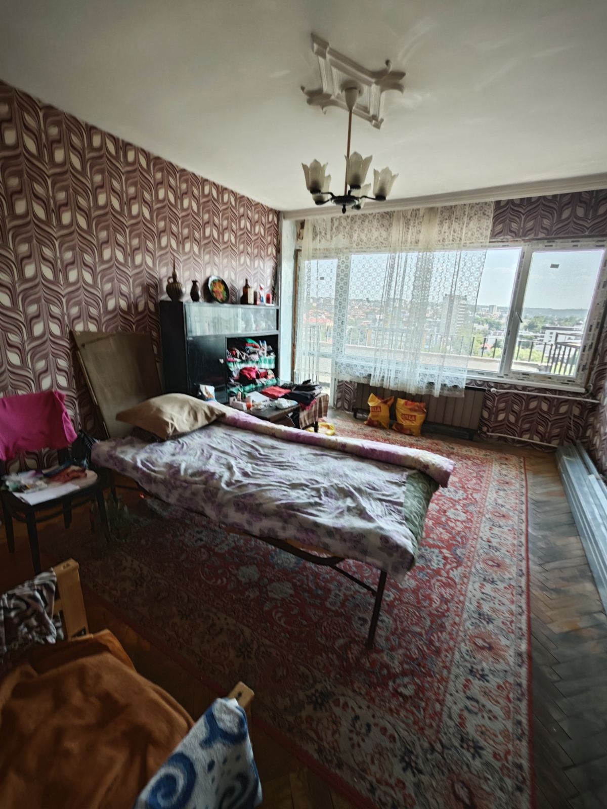 Тристаен апартамент с уникална панорамна гледка в най-красивия район на града. Жилището се състои от две спални, хол, кухня, коридор, баня, тоалетна, килер и тераса, обхващаща цялото жилище. Апартамента е за ремонт, но има и частични подобрения., дограма, паркет