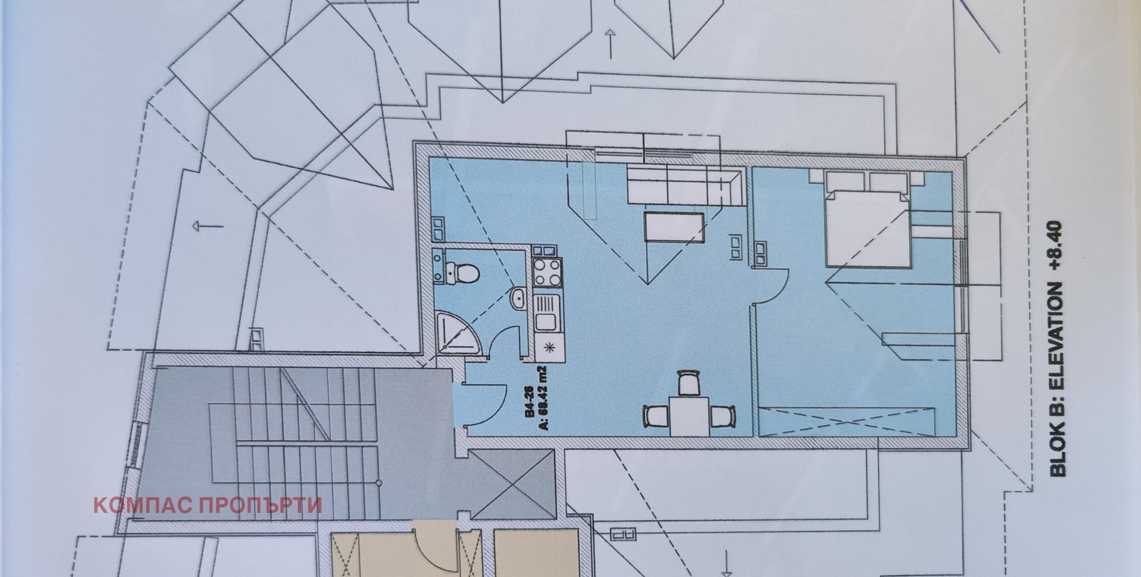 РАЗПРЕДЕЛЕНИЕ: антре, всекидневна с трапезария с кухненски бокс, спалян, баня с тоалетна.