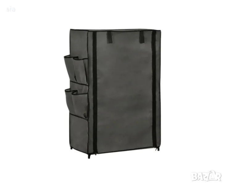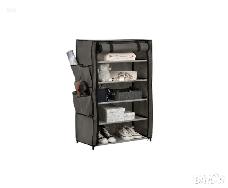 5-местен платнеен гардероб с плат отпред, която се закопчава с цип. Когато не се използва, може да се сгъва и закрепва с каишка за чатала, има крачета, за да не докосва пода, и практични външни джобове за малки предмети. Рамката е от здрав метал, а дизайнът е модерен. Лесно се сглобява и ви помага да спестите място, особено ако пространството ви е ограничено. Цвят