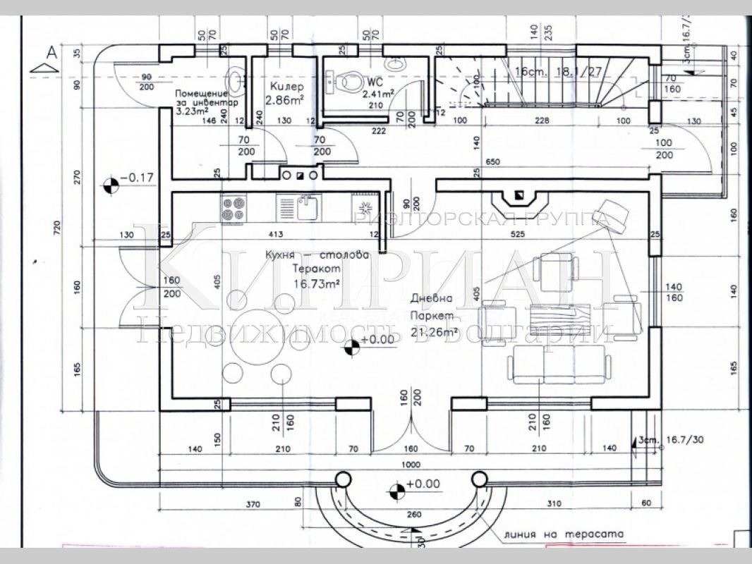 Първи етаж - просторна дневна с кухненска част, тоалетна, помощна стая (перално помещение) и веранда.