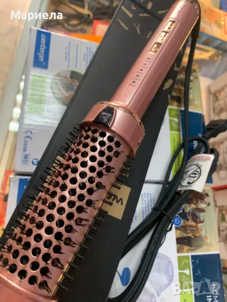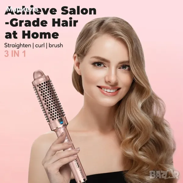 Кръглата четка има турмалиново керамично покритие за равномерно разпределение на топлината, комбинирана с ергономична дръжка и термоустойчиви найлонови влакна, което ви позволява лесно да правите естествени къдрици, да изправяте косата си или да я използвате като обикновен инструмент за стилизиране.