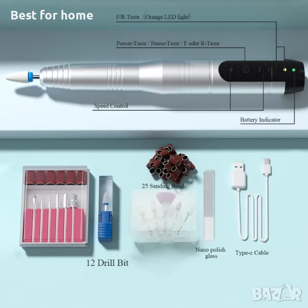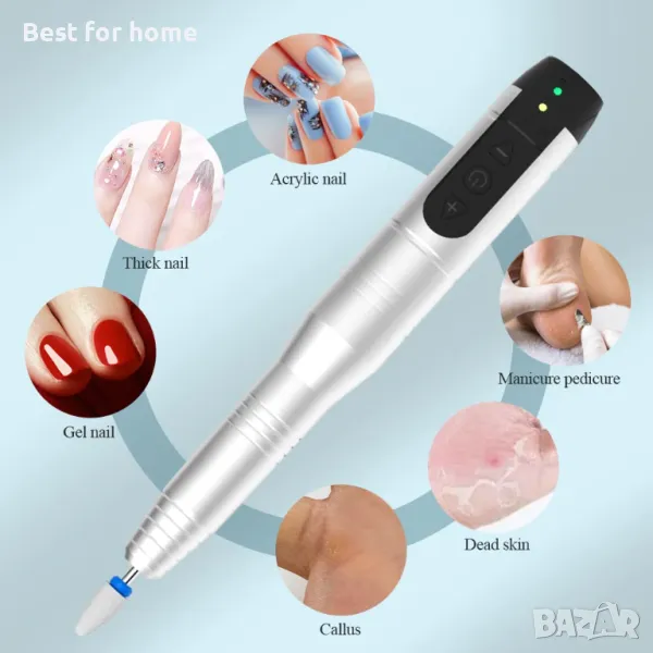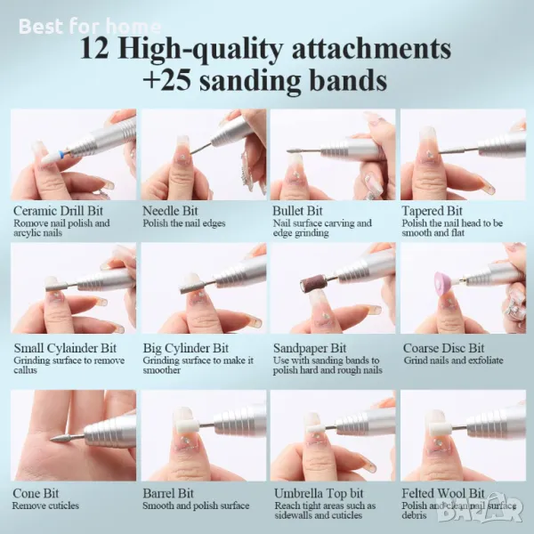 Многофункционален комплект свредла за нокти: С 11 вида метални свредла за нокти и 1 керамично свредло + 25 броя шкурка, професионалната електрическа пила за нокти може да се използва за цялостно оформяне, полиране и премахване на акрилни нокти, полигел нокти, дебели нокти, изкуствени нокти, кожички и др.