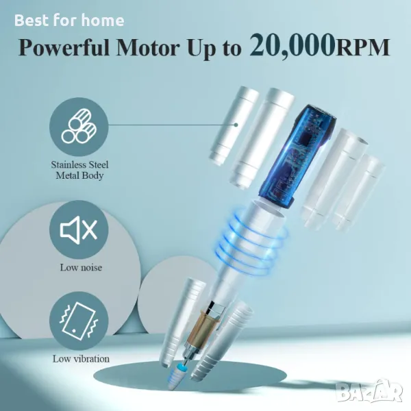Нисък шум и ниски вибрации: Тази безжична електрическа бормашина за нокти се състои от мощен, но тих мотор с по-малко от 40 децибела. Висококачествената алуминиева сплав прави тези бормашини за нокти професионални с ниско нагряване, нисък шум и ниски вибрации.