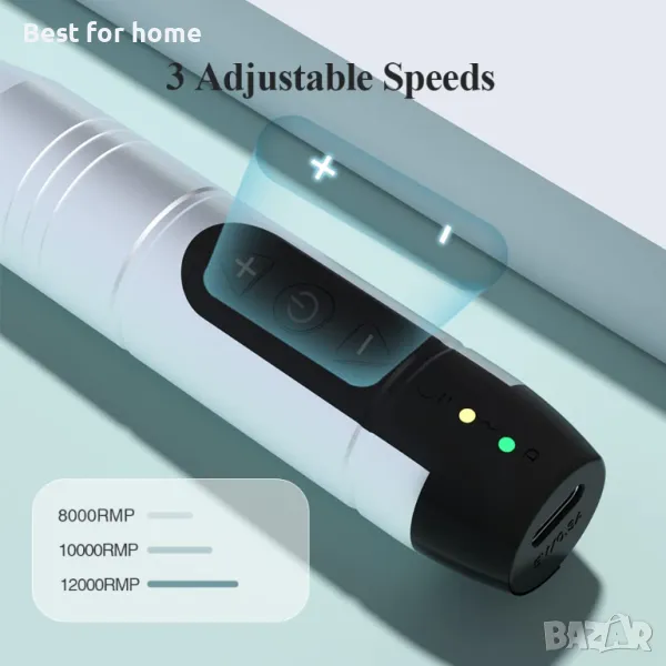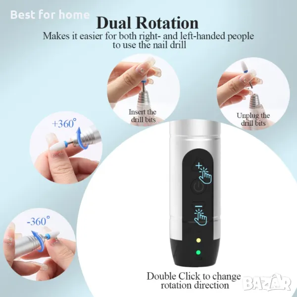 Подобрен мощен мотор: Тази електрическа бормашина за нокти е оборудвана с мощен ротационен мотор с 12 000 об/мин и 3 регулируеми скорости. Посоката на въртене напред/назад е подходяща за хора с дясна или левичари.