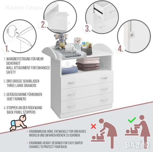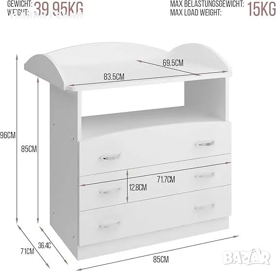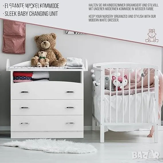 Маса за повиване Infantastic® – 3 чекмеджета, отворени отделения, високо качество, практична, 85 x 71 x 88 см, MDF дърво, бяла - 240.00лв.