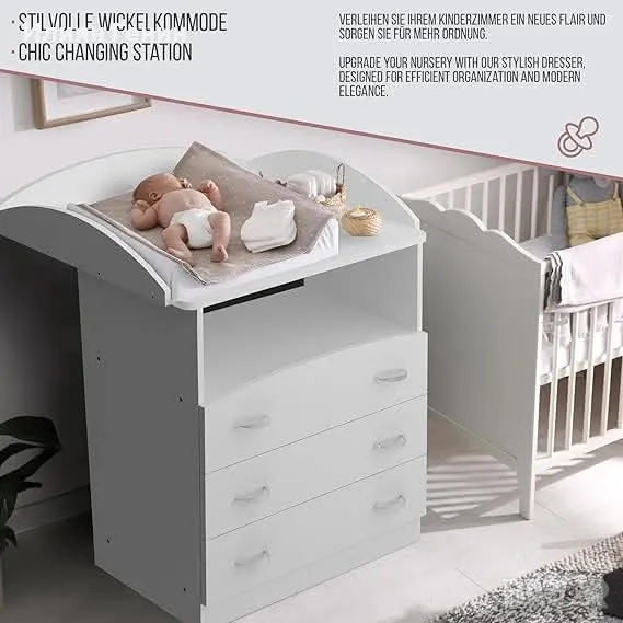Масата за повиване Infantastic съчетава елегантност и практичност, за да отговори на нуждите на младите родители. Масата за повиване на бебета, проектирана с висококачествени материали, тази маса за повиване се отличава със своята здравина и ергономичен дизайн. С три просторни чекмеджета и отворени отделения, този бял скрин предлага оптимално място за съхранение в спалнята, за да държите пелените, дрехите и аксесоарите под ръка. Идеален за детска спалня или всекидневна, идеално се вписва във всеки интериор.