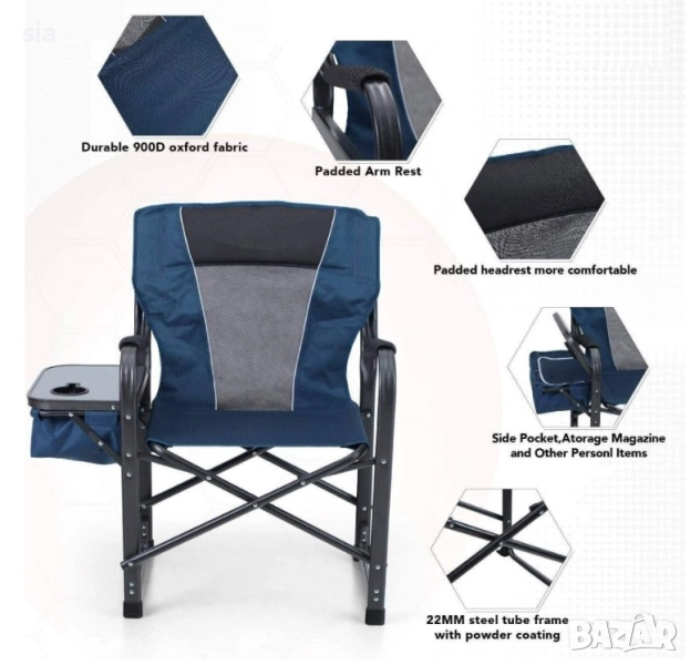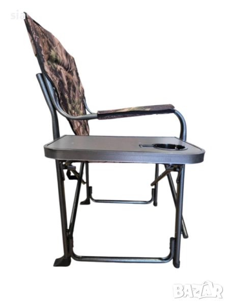 Освен удобството, този сгъваем стол разполага с масичка и подставка за чаша, което го прави практичен за поставяне на напитки, храна, телефон, книги, списания и др..