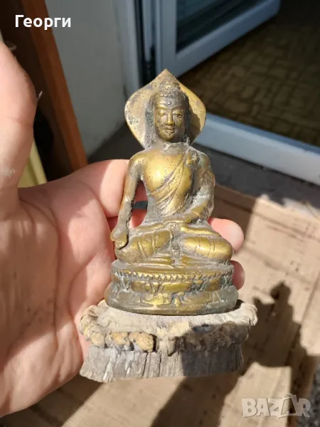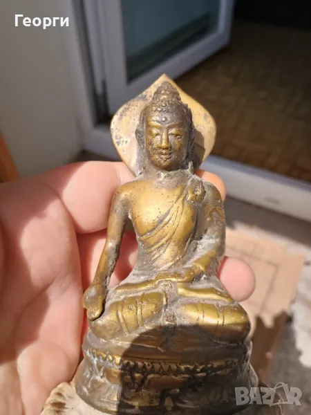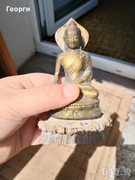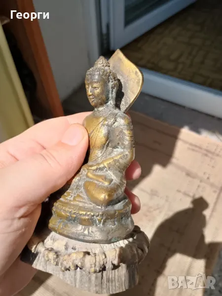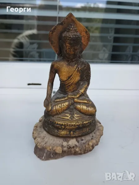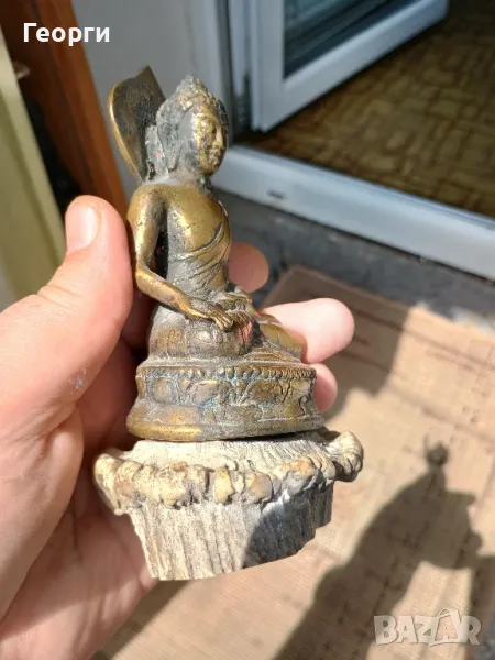 Много красива стара бронзова статуетка,Буда.Подложката е от естествена кост.Височина 15 сантиметра.