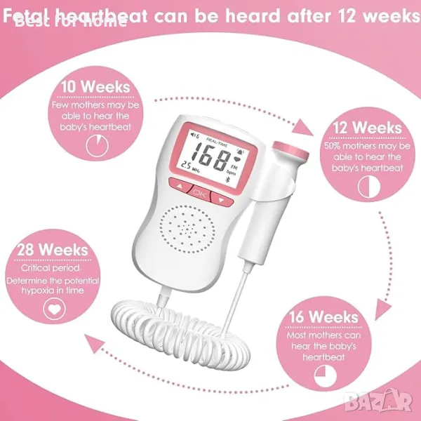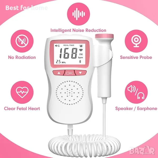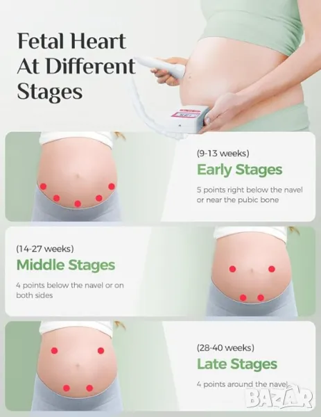 Фетален доплер монитор за бременни жени, вътрематочно наблюдение на жизнените функции на плода, откриване на сърдечен ритъм на плода, наблюдение на сърдечната честота на бебето, преносим, нулева радиация