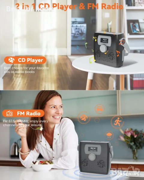 [Висококачествен звук и семпъл дизайн] Този преносим CD бумбокс има вградени 2 3W високоговорителя, които могат да осигурят ясен и плътен стерео звук. LED индикатор, контрол на силата на звука и прости бутони го правят лесен за употреба. Преносимият дизайн с дръжка и водоустойчивост IPX4 ви позволява да бъдете свободни от ограниченията на околната среда. Той е добър спътник за кухня, баня, пикник, къмпинг, разходки, бягане, риболов и туризъм и др.