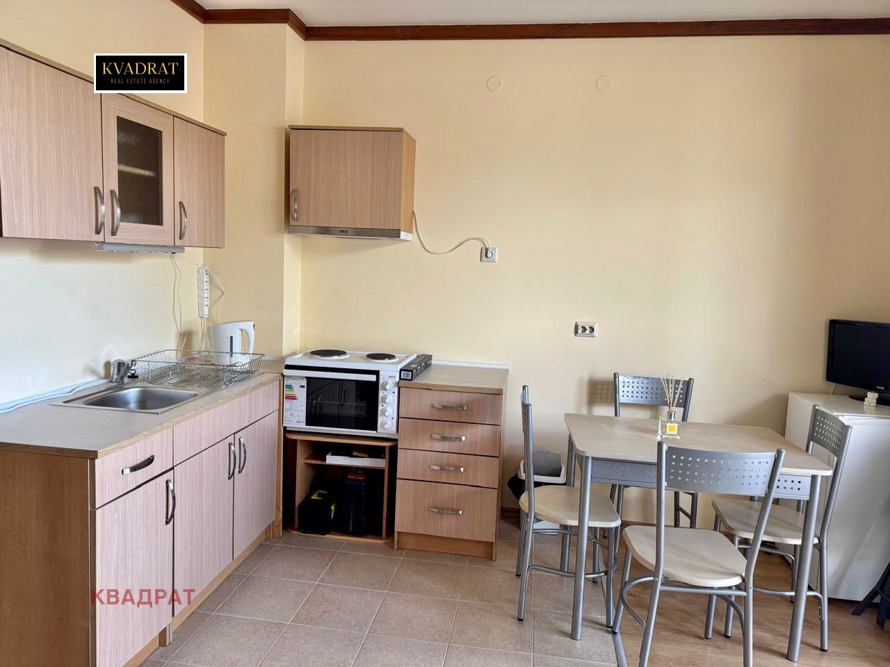 Studio is located on the ground floor with a spacious and sunny terrace with eastern exposure. Fully furnished: Sofa, TV, double bed, electric convector for heating, built-in large boiler and washing machine, kitchen with oven and extractor hood, small refrigerator, wardrobe, bathroom with bathtub, terrace.