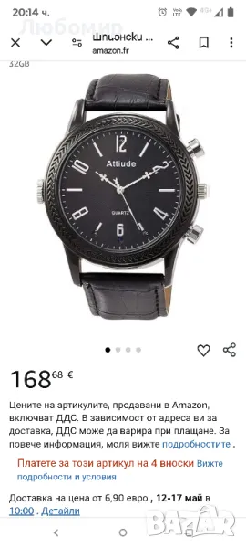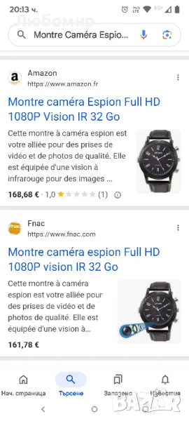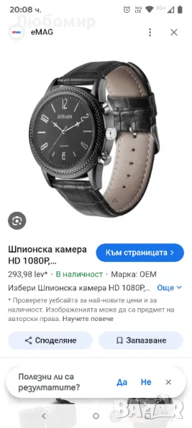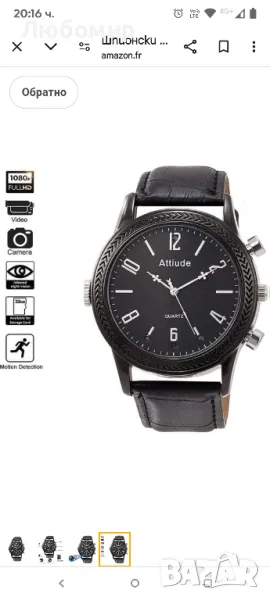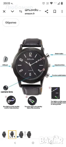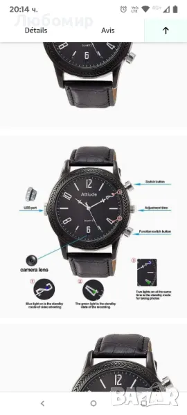 Липсва USB кабела.Стилен мъжки часовник със скрита камера с нощно виждане– Изглежда и работи като истински часовник– Автоматични IR диоди / невидими за човешките очи / 940nm– Автоматично включване на диодите (при пълен мрак)– Осветеност: до 1 метър (при пълен мрак)– Памет: 32GB / вградена /– Показва : час , минута , секунда– Вграден микрофон : Да– Записва само аудио файл– Формат аудио : WAV– Формат видео : AVI– Резолюция видео : 1920 х 1080 / 1280 х 720 / 640 х 480– Видео съотношение : 16:9– Кадъра в секунда : 30 fps– Формат снимки : JPEG– Резолюция снимки : 4032 х 3072– Минимална осветеност: запис при ниска светлина– Автоматичен баланс на бялото– Батерия : вградена литиево йона– Работно време: около 90 минути– Време за зареждане : около 3 часаНалични са три работни режима, като основният е да записва видео придружено със звук. Другите два са допълнителни, като това са режим за създаване на снимков материал и режим за аудиозапис. Моделът е изработен със стилен дизайн, като по никакъв начин не разкрива скритата си функция.По време на работа информацията се запаметява на вградена памет от 32GB. Тя е напълно достатъчна да събере видео за два пъти и половина пускане на устройството, без да е необходимо да се освобождава място в паметта. Преглеждането, преместването и изтриването на записите се извършва на компютър или лаптоп посредством USB кабела в комплекта.Захранването на камера се извършва от вградена презареждаема батерия. Нейната издръжливост, с един пълен заряд, достига до 95 минути видеозапис. Презареждането се извършва отново на компютър или лаптоп. Часовниковият механизъм се захранва отделно с една батерия тип 377.Докато записва не свети нищо! Не показва по никакъв начин, че работи! Камерата поставена на цифрата шест в часовника е с много високо качество на изображението FULL HD и е много добре скрита.Работата с устройството е много лесна, само с два бутонапри пълен мрак диодите се включват автоматично. Не е необходимо да натискате бутони. Светлината е изцяло невидима за човешкото око, за да не буди подозрение