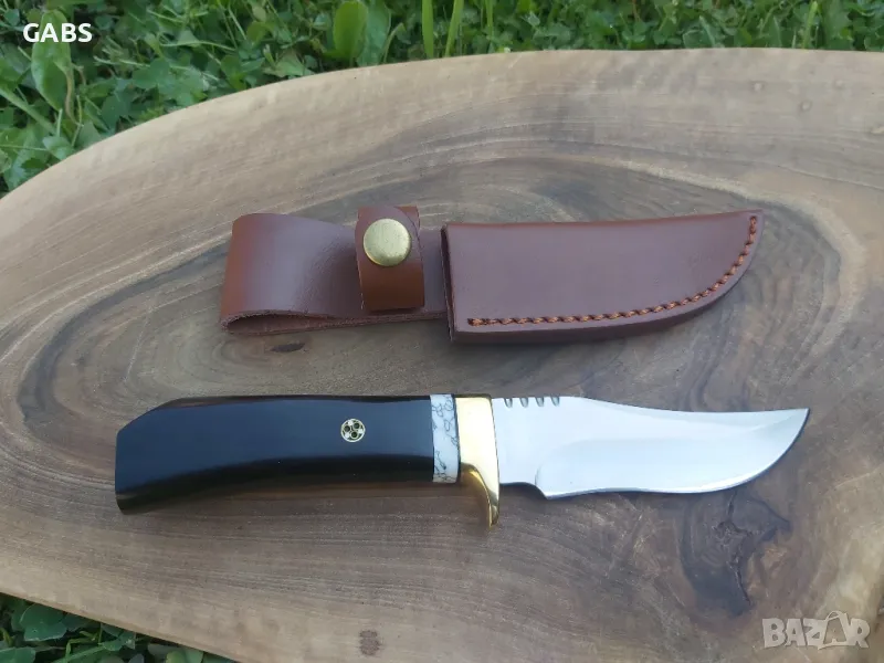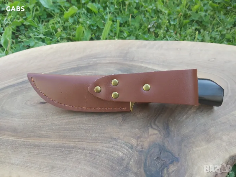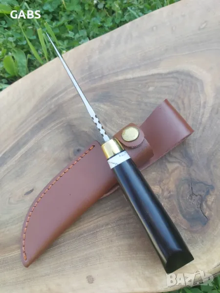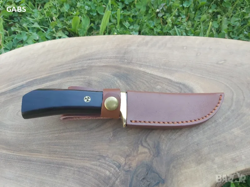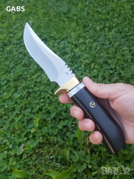 ловен нож с острие от стомана D2 и дръжка от полирано тъмно дърво с месингов гард.Ножа е в комплект с кожена кания.