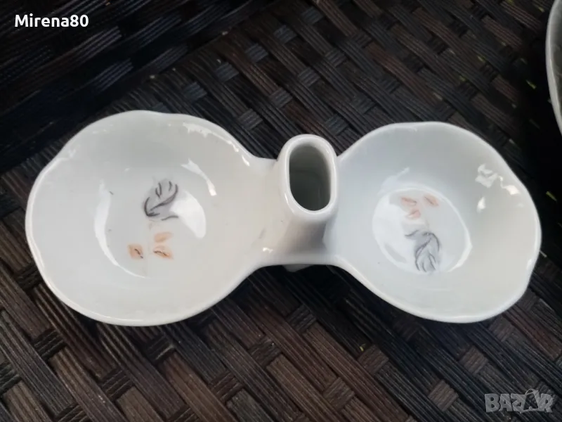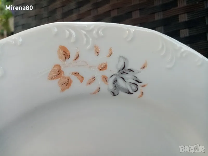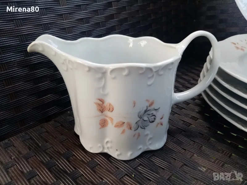 Стар български сервиз - производство на фабриката в Разград. Нов, в оригиналния си кашон, но незнайно защо липсват елипсите ( 1 голяма и 2 малки). Бароков релеф и рядък декор - сива роза - много стилен и елегантен. Сервизът е изключително удобен за ежедневието, защото става и за съдомиялна и за микровълнова.