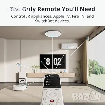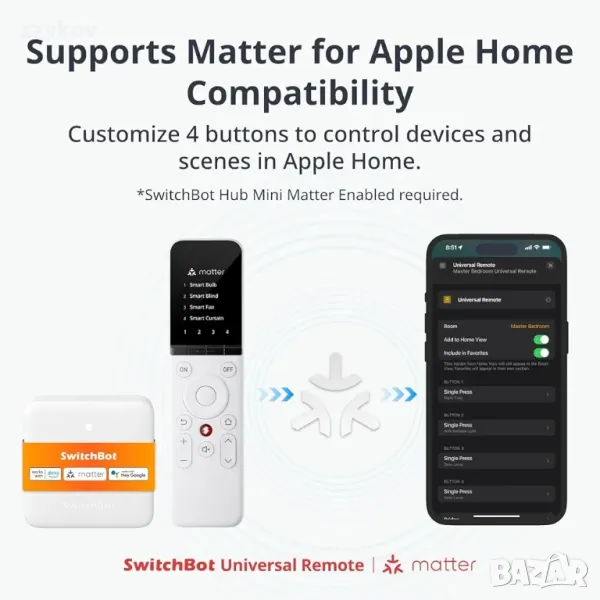 SwitchBot. Могат да се управляват до 25 устройства, което помага за почистване на работния плот и консолидиране на дистанционните ви управления. Можете също така да управлявате други маркови продукти за интелигентен дом чрез Matter!