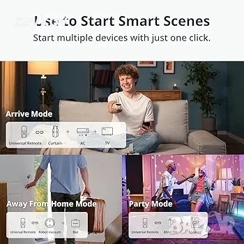 Настройване на автоматизирани сцени: Със сцени можете да управлявате множество устройства само с едно щракване. Например, режим „Напускане на дома“, където можете автоматично да изключвате домакинските уреди и Robovac да започне почистването. Използвайте нашето дистанционно, за да управлявате персонализирани сцени, без да е необходимо да използвате телефона си, което улеснява както възрастните хора, така и децата да управляват устройства едновременно с лекота. (Изисква се мрежова връзка.)