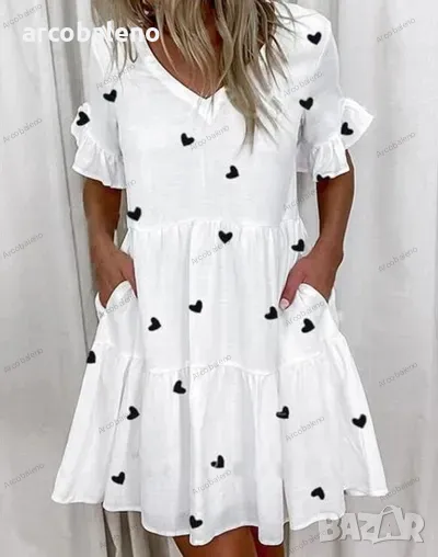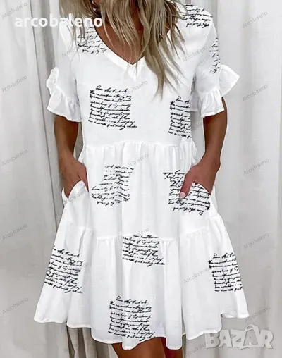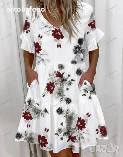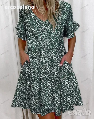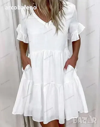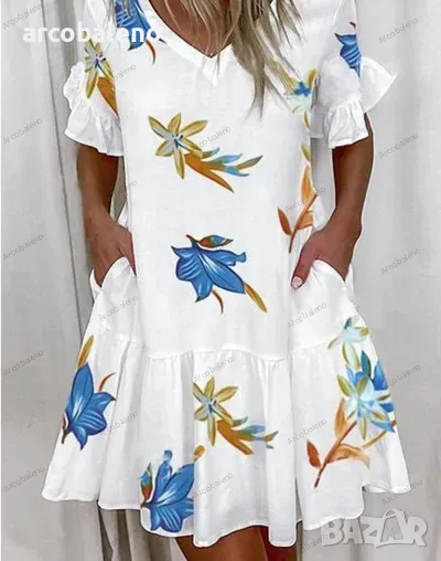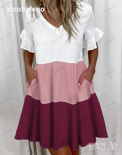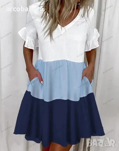 Свободна модна с V-образно деколте къса рокля с джоб и волан, 10цвята