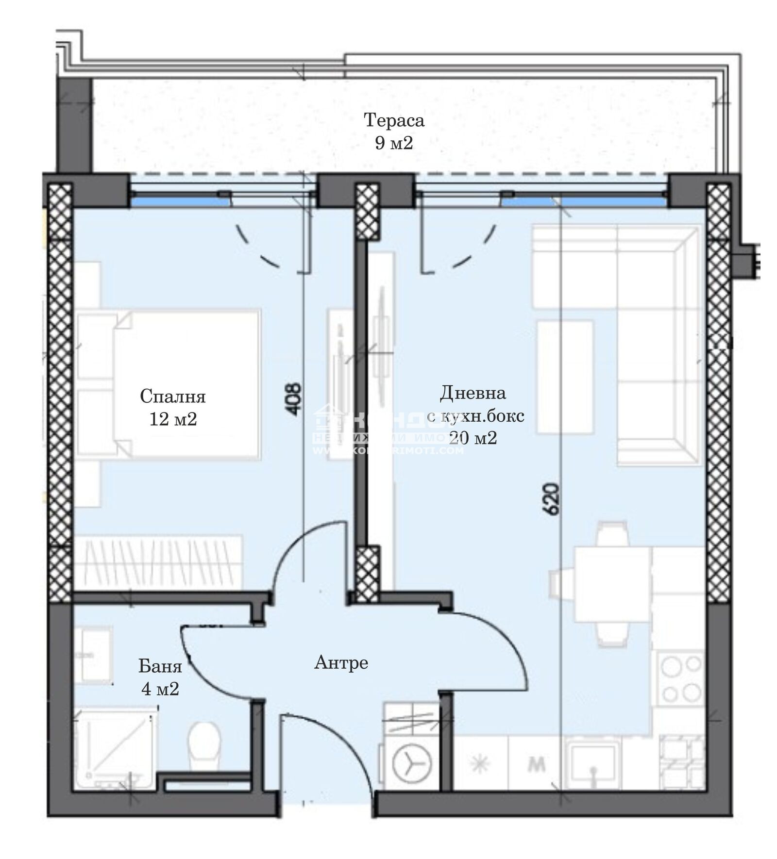 двустаен апартамент в новоизграждащ се луксозен жилищен комплекс с модерна визия, проектиран да създаде максимален комфорт на живущите в него. Функционално разположени жилищни секции с елегантен силует готов да предложи комфорт и модерен начин на живот. Едно от основните му предимства е страхотната локация, отлична комуникативност и динамична пътна инфраструктура, която осигурява бърз и лесен достъп до комплекса от всяка точка на града. Той съчетава лукс, спокойствие и комфорт с подсигурени паркоместа и гаражи. Жилището се състои от дневна с кухненска част, една самостоятелна спалня 12.24кв.м., баня с тоалетна, входно антре с място за перално и една обща панорамна тераса. Основната концепция при проектирането е да се постигнат просторни и функционални стаи, с цел да се създаде максимален уют на модерното семейство. Изключителна съвременна архитектура и модерна технология на строителство. Визията е иновативна, привличаща внимание с уникалността си. Всяко жилище ще разполага с пълно окабеляване за домофон, интернет и кабелна телевизия, общите части са луксозно завършени, жилищата са с алуминиева дограма с троен стъклопакет от най-висок клас, масивна блиндирана входна врата. За удобство на живущите съществува възможността да закупят подземни паркоместа и гаражи с топла връзка към комплекса. Гъвкави схеми на разсрочено плащане спрямо възможностите на клиента в рамките на строителството или закупуване чрез Банков Кредит, на изключително изгодни условия за клиенти на агенцията !!! Приложените изображения са от завършени проекти на строителната фирма.ВИЖТЕ ОЩЕ ИЗГОДНИ ОФЕРТИ НА https://www.kondorimoti.com/ С ЕЖЕДНЕВНА АКТУАЛИЗАЦИЯ!