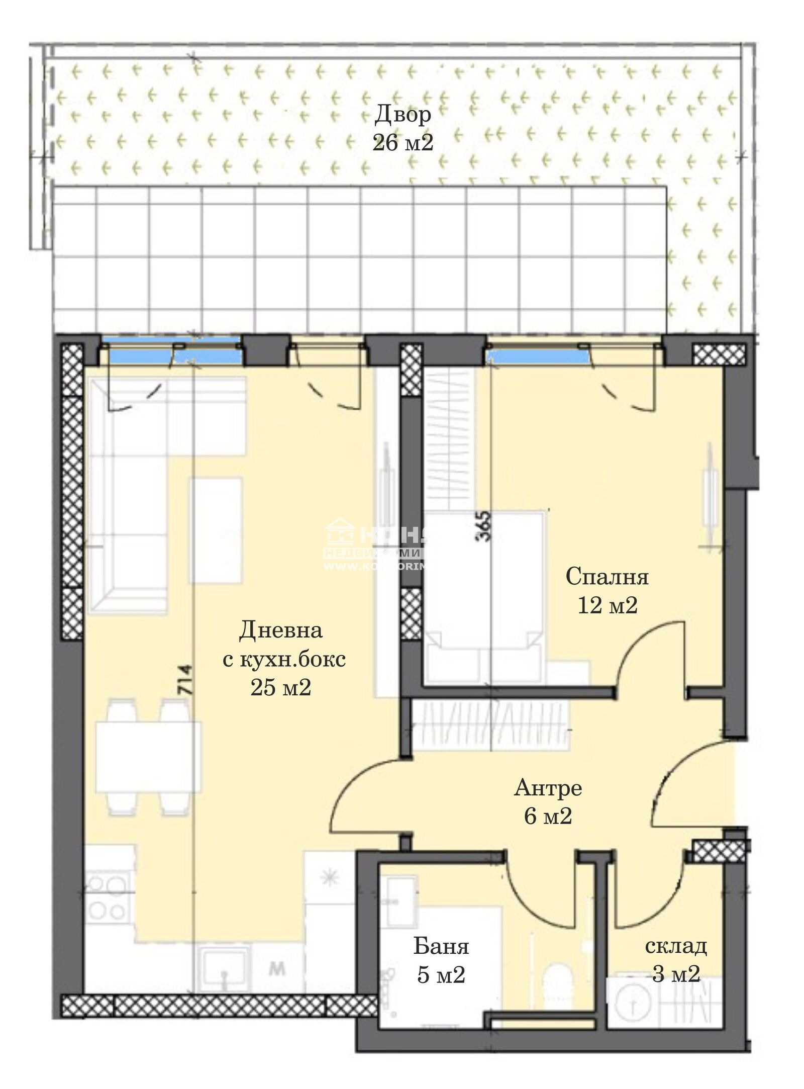 Оферта 66805: Предлагаме Ви възможността да закупите 2 - стаен апартамент в новоизграждащ се луксозен жилищен комплекс с модерна визия, проектиран да създаде максимален комфорт на живущите в него. Функционално разположени жилищни секции с елегантен силует готов да предложи комфорт и модерен начин на живот. Едно от основните му предимства е страхотната локация, отлична комуникативност и динамична пътна инфраструктура, която осигурява бърз и лесен достъп до комплекса от всяка точка на града. Той съчетава лукс, спокойствие и комфорт с подсигурени паркоместа и гаражи. Жилището се състои от светла дневна 25кв.м. с кухненска част и трапезария, една самостоятелна спалня 12.48кв.м., баня с тоалетна, входно антре, склад, веранда и собствен озеленен двор 26кв.м. Основната концепция при проектирането е да се постигнат просторни и функционални стаи, с цел да се създаде максимален уют на модерното семейство. Изключителна съвременна архитектура и модерна технология на строителство. Визията е иновативна, привличаща внимание с уникалността си. Всяко жилище ще разполага с пълно окабеляване за домофон, интернет и кабелна телевизия, общите части са луксозно завършени, жилищата са с алуминиева дограма с троен стъклопакет от най-висок клас, масивна блиндирана входна врата. За удобство на живущите съществува възможността да закупят подземни паркоместа и гаражи с топла връзка към комплекса. Гъвкави схеми на разсрочено плащане спрямо възможностите на клиента в рамките на строителството или закупуване чрез Банков Кредит, на изключително изгодни условия за клиенти на агенцията !!! Приложените изображения са от завършени проекти на строителната фирма.ВИЖТЕ ОЩЕ ИЗГОДНИ ОФЕРТИ НА https://www.kondorimoti.com/ С ЕЖЕДНЕВНА АКТУАЛИЗАЦИЯ!