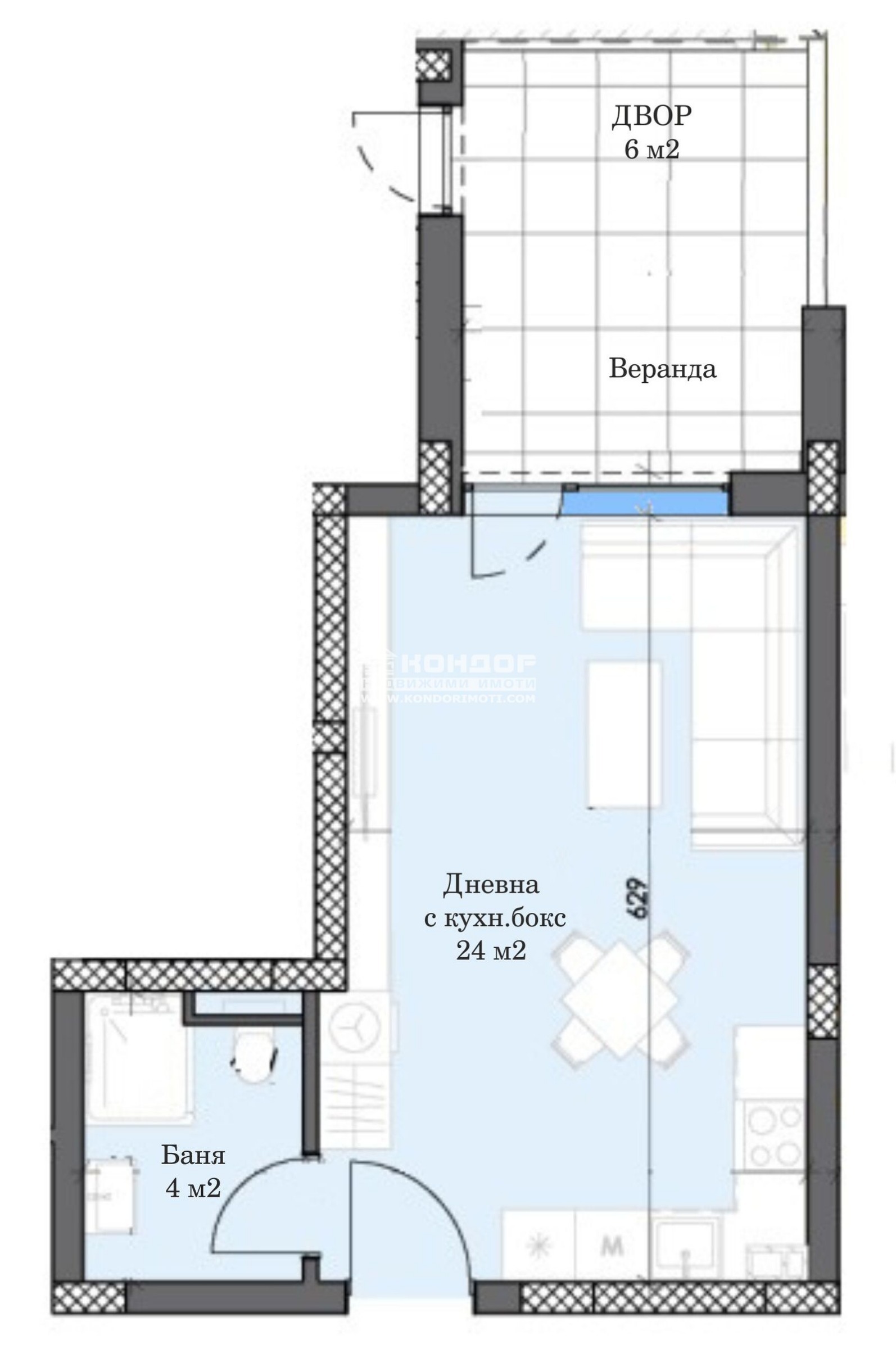 Оферта 66842: Предлагаме Ви възможността да закупите едностаен апартамент тип студио в новоизграждащ се луксозен жилищен комплекс с модерна визия, проектиран да създаде максимален комфорт на живущите в него. Функционално разположени жилищни секции с елегантен силует готов да предложи комфорт и модерен начин на живот. Едно от основните му предимства е страхотната локация, отлична комуникативност и динамична пътна инфраструктура, която осигурява бърз и лесен достъп до комплекса от всяка точка на града. Той съчетава лукс, спокойствие и комфорт с подсигурени паркоместа и гаражи. Жилището се състои от дневна 24кв.м. с кухненска част и трапезария, баня с тоалетна, веранда и собствен двор 6кв.м. Към апартамента има прилежащо избено помещение включено в цената. Основната концепция при проектирането е да се постигнат просторни и функционални стаи, с цел да се създаде максимален уют на модерното семейство. Изключителна съвременна архитектура и модерна технология на строителство. Визията е иновативна, привличаща внимание с уникалността си. Всяко жилище ще разполага с пълно окабеляване за домофон, интернет и кабелна телевизия, общите части са луксозно завършени, жилищата са с алуминиева дограма с троен стъклопакет от най-висок клас, масивна блиндирана входна врата. За удобство на живущите съществува възможността да закупят подземни паркоместа и гаражи с топла връзка към комплекса. Гъвкави схеми на разсрочено плащане спрямо възможностите на клиента в рамките на строителството или закупуване чрез Банков Кредит, на изключително изгодни условия за клиенти на агенцията !!! Приложените изображения са от завършени проекти на строителната фирма.ВИЖТЕ ОЩЕ ИЗГОДНИ ОФЕРТИ НА https://www.kondorimoti.com/ С ЕЖЕДНЕВНА АКТУАЛИЗАЦИЯ!