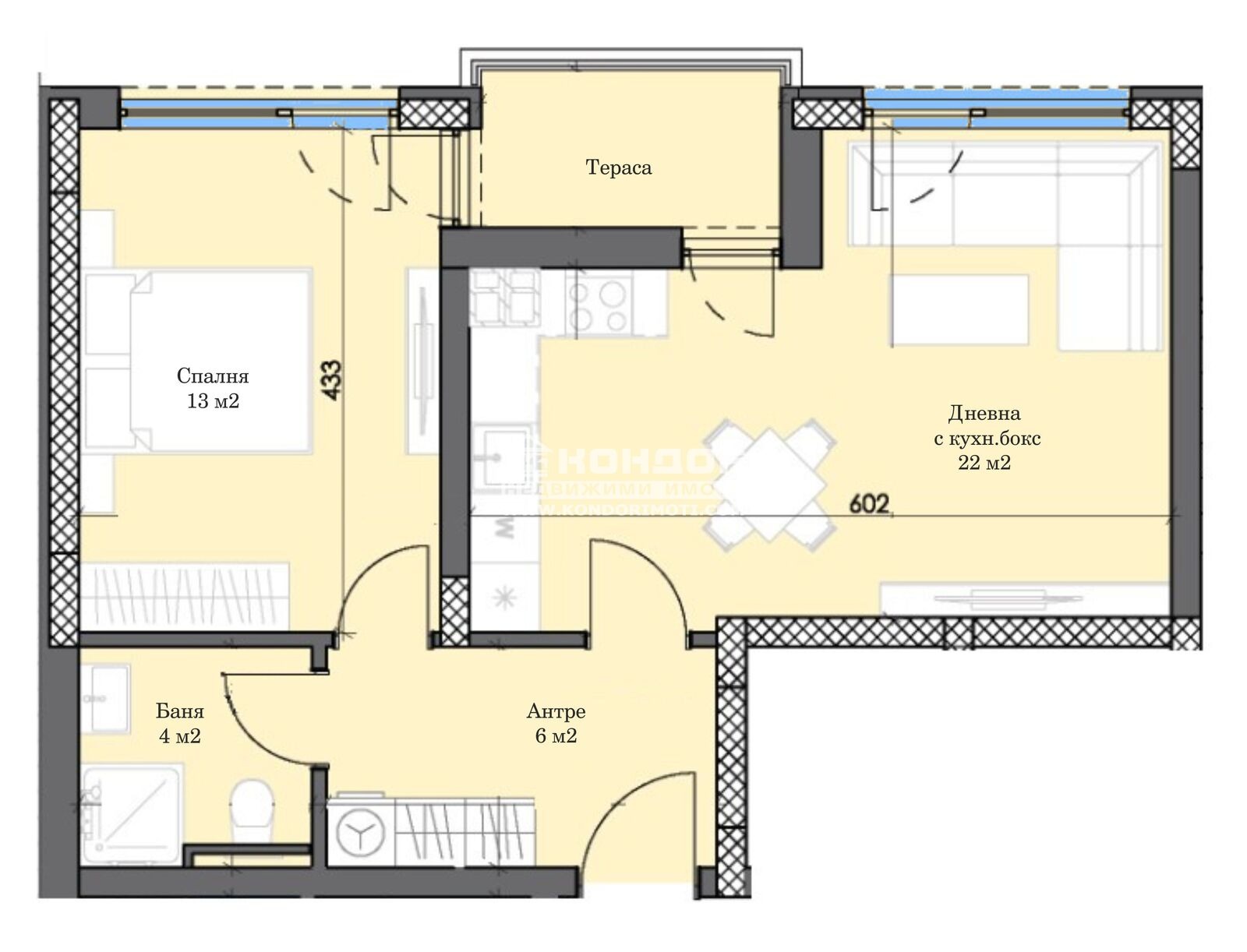 Оферта 66813: Предлагаме Ви възможността да закупите двустаен апартамент в новоизграждащ се луксозен жилищен комплекс с модерна визия, проектиран да създаде максимален комфорт на живущите в него. Функционално разположени жилищни секции с елегантен силует готов да предложи комфорт и модерен начин на живот. Едно от основните му предимства е страхотната локация, отлична комуникативност и динамична пътна инфраструктура, която осигурява бърз и лесен достъп до комплекса от всяка точка на града. Той съчетава лукс, спокойствие и комфорт с подсигурени паркоместа и гаражи. Жилището се състои от светла дневна 22кв.м. с кухненска част и трапезария, една самостоятелна спалня 13.42кв.м., баня с тоалетна, входно антре с място за перално и една обща тераса. Основната концепция при проектирането е да се постигнат просторни и функционални стаи, с цел да се създаде максимален уют на модерното семейство. Изключителна съвременна архитектура и модерна технология на строителство. Визията е иновативна, привличаща внимание с уникалността си. Всяко жилище ще разполага с пълно окабеляване за домофон, интернет и кабелна телевизия, общите части са луксозно завършени, жилищата са с алуминиева дограма с троен стъклопакет от най-висок клас, масивна блиндирана входна врата. За удобство на живущите съществува възможността да закупят подземни паркоместа и гаражи с топла връзка към комплекса. Гъвкави схеми на разсрочено плащане спрямо възможностите на клиента в рамките на строителството или закупуване чрез Банков Кредит, на изключително изгодни условия за клиенти на агенцията !!! Приложените изображения са от завършени проекти на строителната фирма.ВИЖТЕ ОЩЕ ИЗГОДНИ ОФЕРТИ НА https://www.kondorimoti.com/ С ЕЖЕДНЕВНА АКТУАЛИЗАЦИЯ!