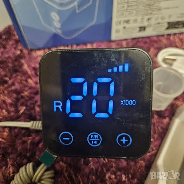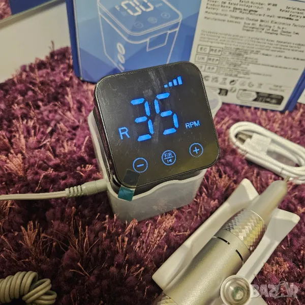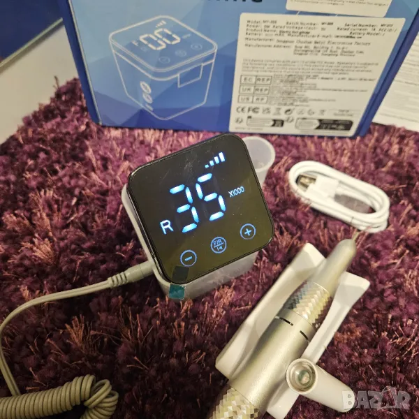 Нов модел пила за маникюр с контролер със сензорен дисплей. В комплекта е включено UV фенерче, което се зарежда в станцията на пилата. Пилата работи безкабелно - на батерия. Ръкохватката е удобна, включена е стойка. Изпращам с подарък качествена фрезичка за сваляне на геллак и обработка на кожички. 35000 оборота