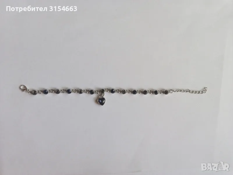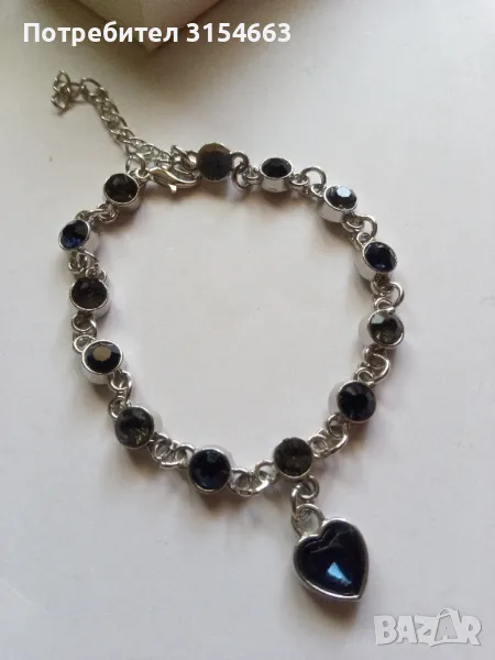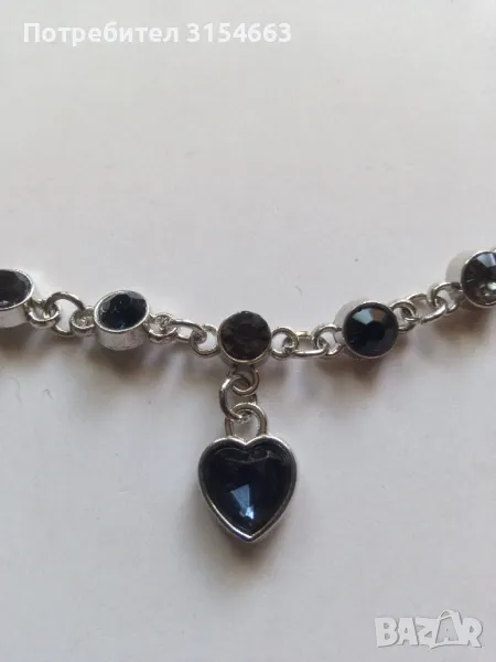 Гривна с кристали. Размери: дължина 19 см + 5 см удължител, ширина 0,5 см. Висулка с форма на сърце с размери 1 см на 1 см.