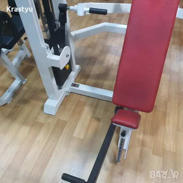 Оригинален уред за средно рамо от наклон , марка GYM 80, запазен оригинална боя , механизъм за лесно вземане на ръкохватките , ремък , изключително здрав и удобен уред