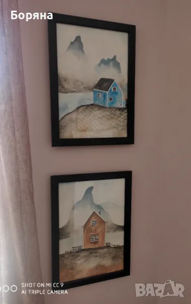 Нова картина с рамка и стъкло отгоре - рисувана от българска художничка, има страница във фейсбук, мога да дам координати. Купих си 3те картини - тематично свързани - 3 планински къщички в различен цвят и стил. За съжаление за тази не ми остана място от предвиденото на стената и затова се разделям с нея.