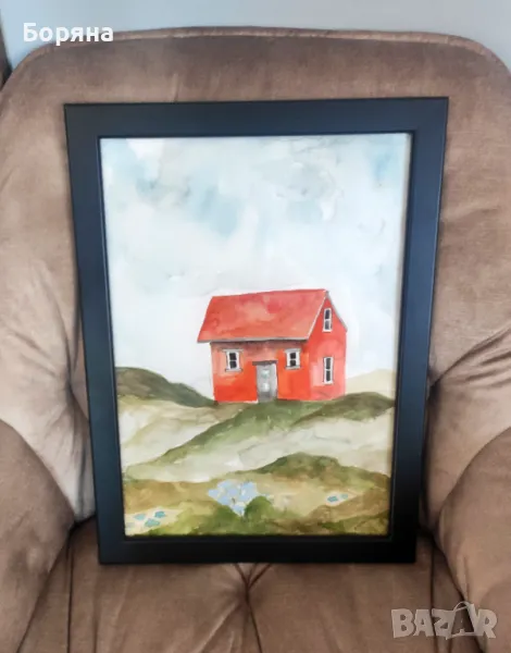 Нова картина с рамка ръчно рисувана акварел червена планинска къща → Обява 50139536