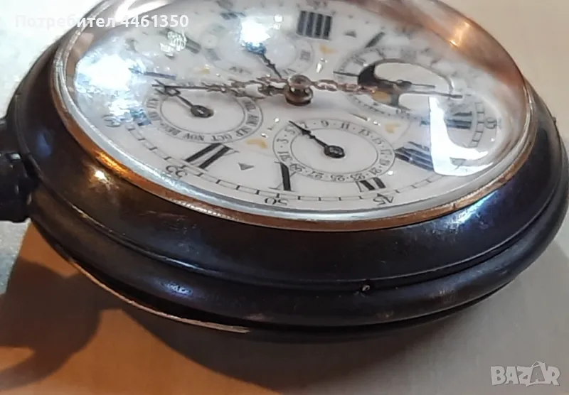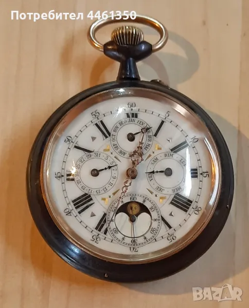 Голям Швейцарски джобен часовник Лунна фаза. Показва седмицата,месеца,датата. Работи със всичките си функции. Система Швейцарски анкер. Сменя всички стрелки на собствен ход ,а така също и ръчно. Бутоните също работят. Произведен 1903 г.Оксидирани стоманени капаци. Полирани бронзови елементи . Много дебело стъкло. Размер 68 мм. Работи перфектно.