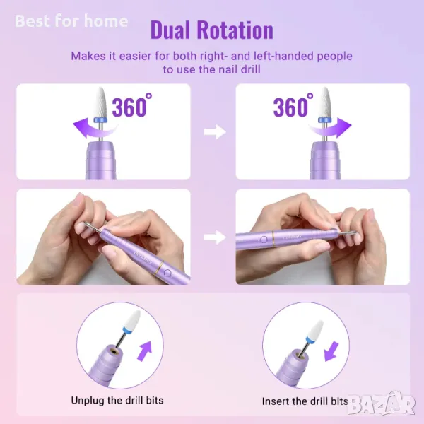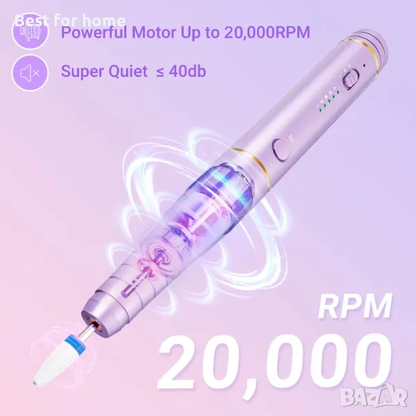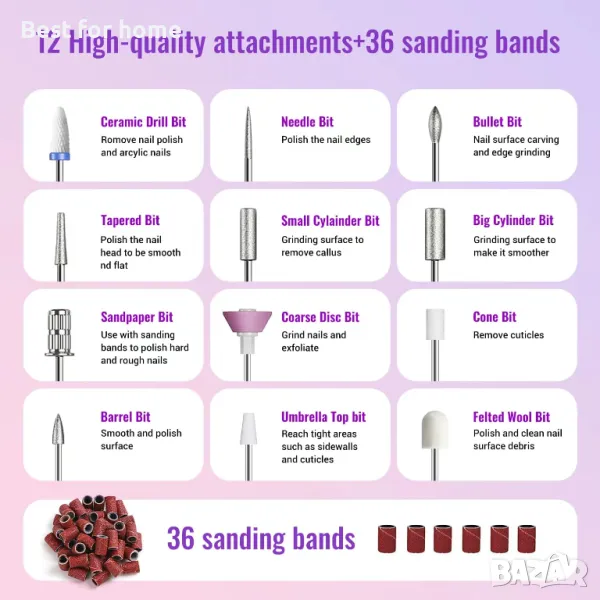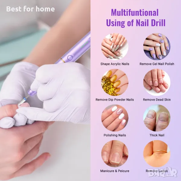 Безжична нокторезачка: Тази електрическа нокторезачка е специално разработена за маникюр, педикюр и премахване на гел нокти, шеллак, акрил, както и за полиране на кожички и мъртва кожа. Тя е готова за почти всяка работа с нокти с множество универсални резервни части 3/32 инча: 12 различни свредла, 36 шлифовъчни ленти и 1 капак против прах.