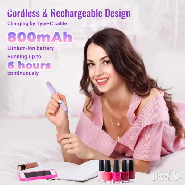 Презареждаща се през USB: за разлика от други електрически пили за нокти, тя може да се използва не само чрез USB, но и презареждаща се. Вградената литиева батерия с капацитет 800 mAh осигурява поне 6 часа непрекъсната употреба, когато е напълно заредена (6 часа).