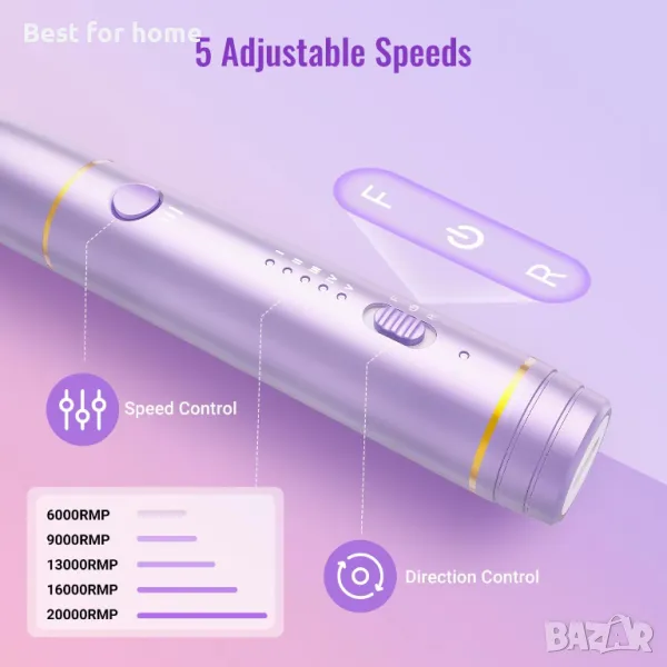 Регулируема скорост и посока на въртене: ножът за гел нокти има 5 настройки за скорост, максимална скорост до 6000-20000 об/мин, работа с бутони и светлинен дисплей. Посоката на въртене е регулируема напред и назад, подходяща за левичари и десничари.