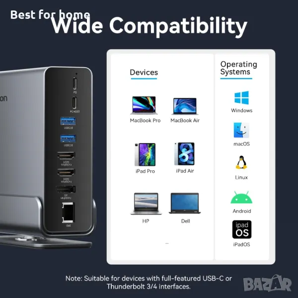 ШИРОКА СЪВМЕСТИМОСТ С USB-C И THUNDERBOLT ЛАПТОПИ: Тази USB-C докинг станция е съвместима с лаптопи с USB-C или Thunderbolt 3/4 портове, като например Dell XPS 13/15, HP, Lenovo и Surface Book 2. Преди покупка, моля, проверете дали вашият лаптоп поддържа DisplayPort Alternate Mode.