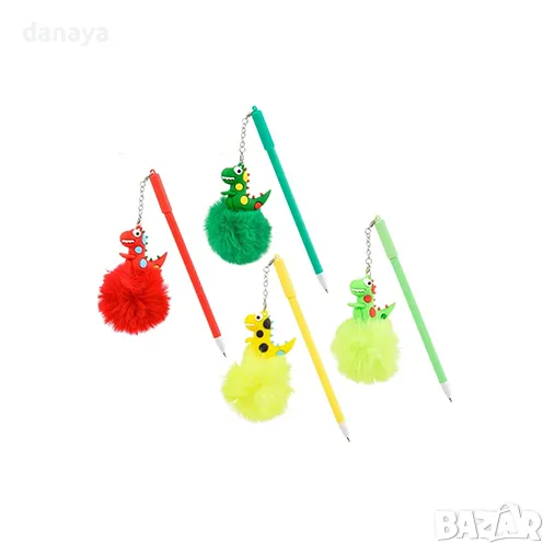 🦖 На капачката – забавно гумено динозавърче, стоящо върху мека пухена топка, която внася цвят и настроение на бюрото ти.