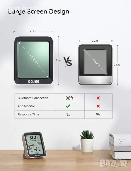 Интелигентни функции: Безжичният термометър-хигрометър Govee поддържа всички основни функции, както и интелигентни функции, като дистанционно наблюдение и графики на температурата и влажността. Нашите измервателни уреди за влажност са надеждни и лесни за употреба за домове, оранжерии и други. (Поддържа само Bluetooth връзка от 50 метра)
