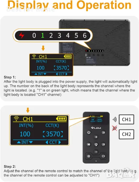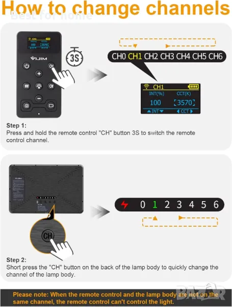 【Как се сдвоява】: След като осветителното тяло е включено, то ще се включи автоматично. Числото на гърба на осветителното тяло е каналът, където се намира лампата. Натиснете и задръжте бутона "CH" на дистанционното управление за 3 секунди, за да превключите канала на дистанционното управление. Натиснете кратко бутона "CH" на гърба на лампата, за да превключите бързо канала на активната светлина. Моля, обърнете внимание: Когато дистанционното управление и активната лампа не са на един и същи канал, дистанционното управление не може да управлява светлината.