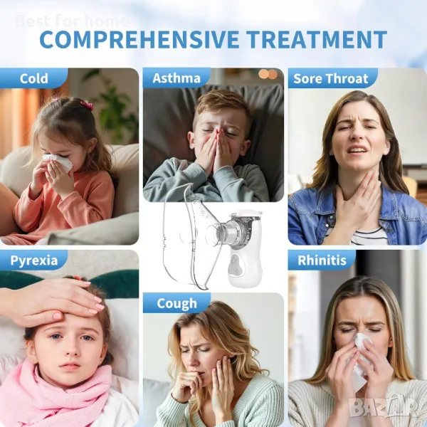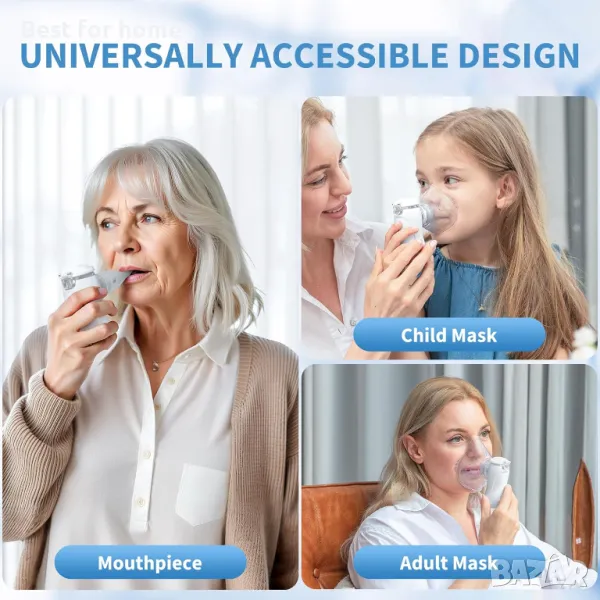 Домашна употреба: аксесоарите за инхалатора-пулверизатор FEELLIFE включват мрежест инхалатор, мундщук и маски за лице за възрастни и деца. Може да се използва от цялото семейство, като същевременно се гарантира хигиенична употреба. Това е защитна мярка за защита на цялото семейство, ако се разболеят от грип. Чашката за лекарството също е лесна за сваляне и почистване и е идеална за ежедневно пътуване и домашни грижи.