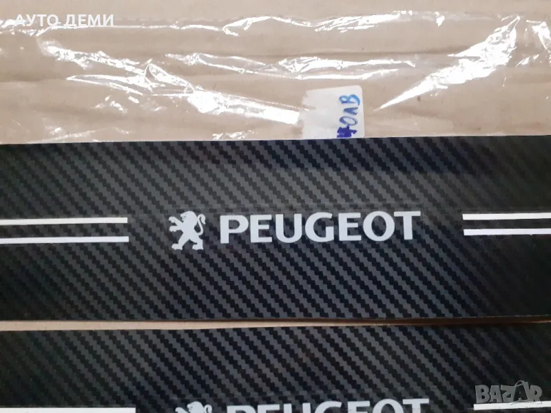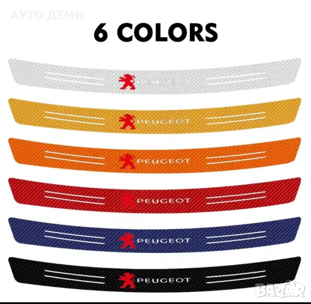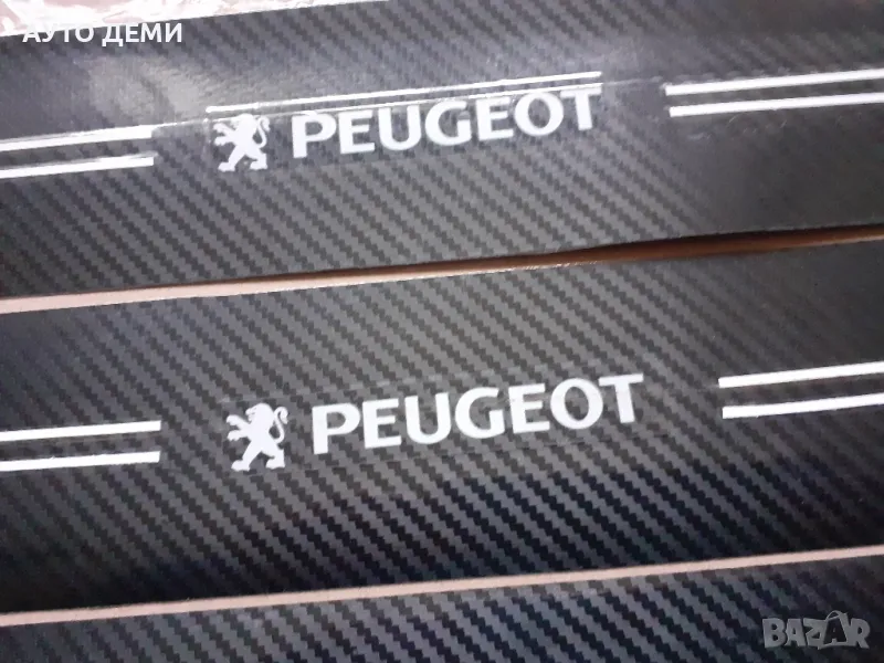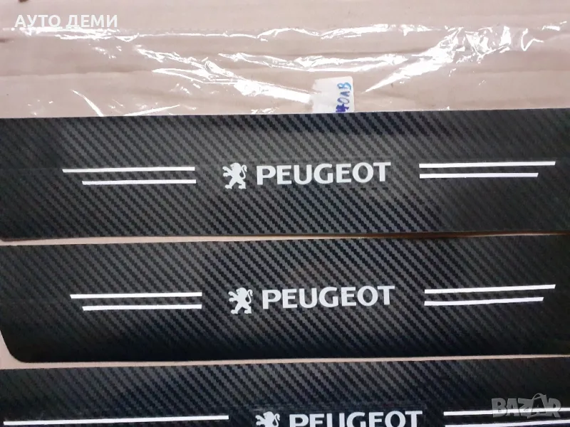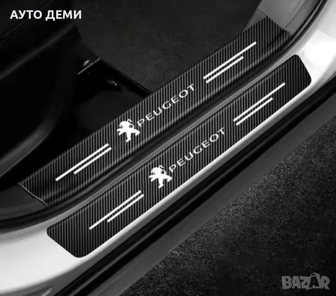 Продавам карбонови самозалепващи стикери за прагове и броня на автомобил с изцяло бяла емблема и надпис на Пежо .