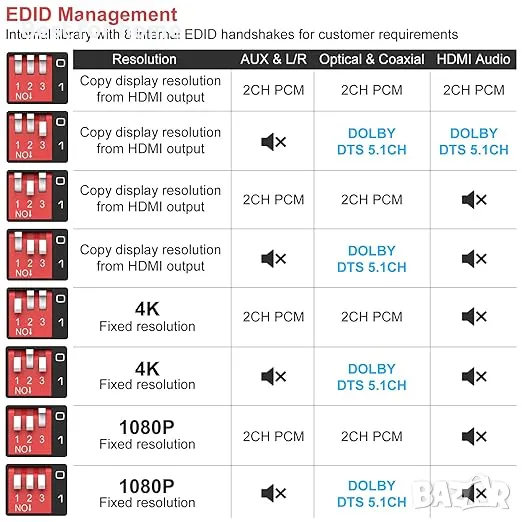 【EDID система】8 режима на работа, можете лесно да зададете желаната конфигурация с червения превключвател. Можете автоматично да преминете през алгоритъма, за да съпоставите EDID данните на източника на сигнала и дисплея, или можете да използвате вградените фиксирани EDID данни, за да се уверите, че могат да се използват правилно. Устройството може да контролира дали HDMI изходът има звук или не.