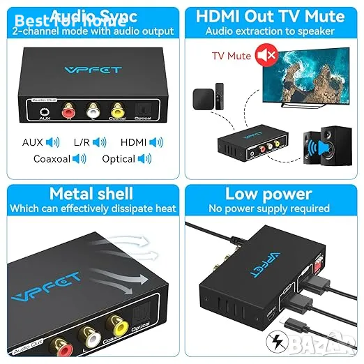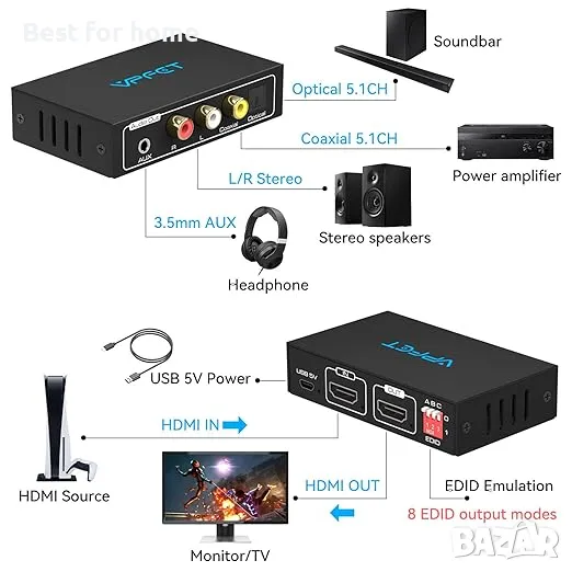【HDMI аудио екстрактор】HDMI аудио екстракторът може да извлича аудио от HDMI сигнал и да го предава към AV приемник чрез оптичен, коаксиален, L/R или 3,5 мм кабел. (Забележка: Устройствата не поддържат ARC и eARC.TV не се поддържа като входен източник.)