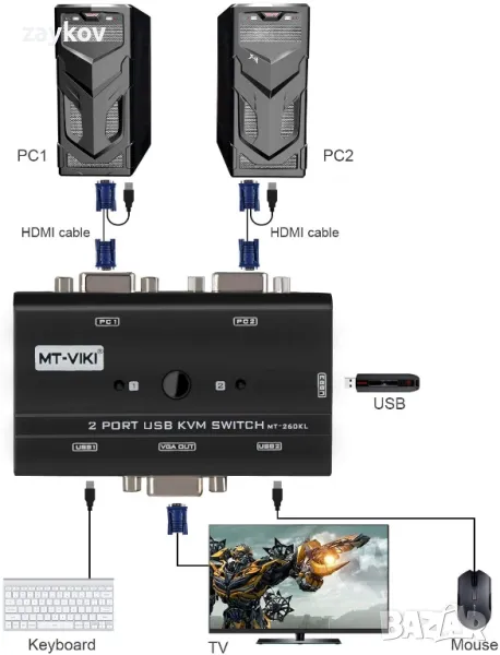 Двупортовият VGA KVM превключвател】ви позволява да управлявате 2 компютъра с един набор от контроли (мишка, клавиатура и монитор). Забележка: За да споделите 1 принтер, уверете се, че 2 компютъра са включени.