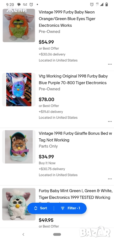 ΠΠ³ΡΠ°ΡΠΊΠΈΡΠ΅ ΡΠ° ΠΎΡΠΈΠ³ΠΈΠ½Π°Π»Π½ΠΈ Furby Tiger Electronics, Π² ΠΌΠ½ΠΎΠ³ΠΎ Π΄ΠΎΠ±ΡΠΎ ΡΡΡΡΠΎΡΠ½ΠΈΠ΅, ΡΠ°Π±ΠΎΡΠ΅ΡΠΈ. Π¦Π΅Π½Π°ΡΠ° Π΅ Π·Π° 1 Π±ΡΠΎΠΉ. ΠΡΠΈ ΠΈΠ½ΡΠ΅ΡΠ΅Ρ ΡΠ΅ Π½Π°ΠΏΡΠ°Π²Ρ Π΄Π΅ΡΠ°ΠΉΠ»Π½ΠΈ ΡΠ½ΠΈΠΌΠΊΠΈ ΠΈ ΠΊΠ»ΠΈΠΏΡΠ΅ΡΠ°.